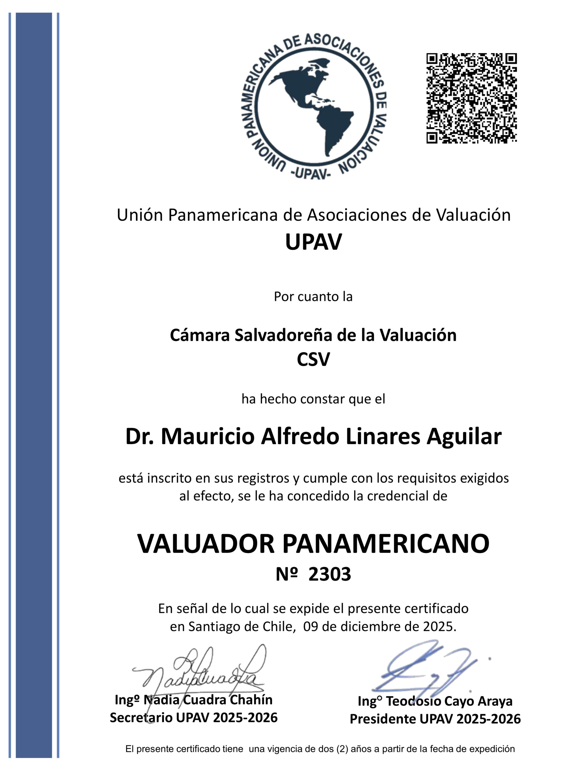 Accredited as a Pan-American appraiser by the UPAV, Pan-American Union of Valuation Associations.