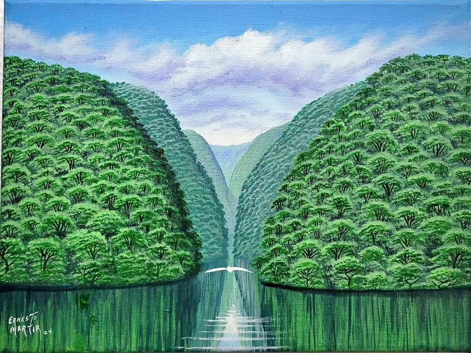 En el continuo histórico, Ernesto Mártir es un heredero de la tradición paisajística naif que se produjo en Centro América en los años ochenta y principios de los noventa del siglo XX. Luego, la corriente paisajista cubana también influye en el paisaje de Mártir. Sin embargo, su visión lo conduce hacia un rumbo personal que combina la abundancia de la vegetación tropical con otra vegetación imaginaria que parece también real y que es, en esencia, muy suya. Además, Mártir crea otra línea de paisajes que muestran una fase diferente del trópico: sus vegetaciones imaginarias retorcidas como impenetrables manglares y áridos bosques costeros poblados de aves mágicas y misteriosas. En este conjunto de obras más expresionistas el artista usa metáforas visuales que aluden a los mitos ancestrales mesoamericanos y en especial salvadoreños. Mártir explora incluso preocupaciones ecológicas y sociales con intensa devoción psicológica. Así, el artista muestra otra dimensión que complementa y acaso nos advierte de las entrañas profundas de aquellas sus extensiones de vegetación tropical de aparente calma infinita.